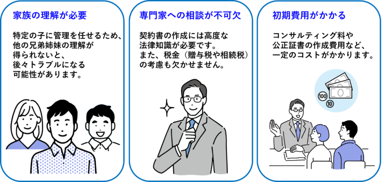 民事信託で家族の未来を守るBy 丸山 主税 / 2025年12月25日 「人生100年時代」といわれる今、老後の不安として「認知症」や「財産管理」を挙げる方が増えています。そこで注目を集めているのが**「民事信託(通称:家族信託)」**です。難しい言葉に聞こえますが、本質はとてもシンプル。今回は、大切な財産と家族の未来を守るこの仕組みについて、分かりやすく解説します。 民事信託とは「財産の管理を家族に託す」こと 民事信託を一言でいうと、**「信頼できる家族に、特定の目的のために自分の財産を託し、管理・運用してもらう仕組み」**のことです。通常、銀行口座や不動産は名義人本人しか動かせません。しかし、民事信託という契約を結んでおくことで、もし本人が判断能力を失っても、託された家族がスムーズに預金を引き出したり、家を売却したりできるようになります。登場人物は3人だけ。民事信託を理解するために、以下の3つの役割をイメージしてみましょう。 親が「委託者」として子(受託者)に財産を託し、その財産から出る利益を「受益者」として親自身が受け取る、という形が一般的です。 なぜ今、民事信託が必要なのか? 最大のメリットは、「認知症による資産凍結」を防げる点にあります。 1. 認知症対策としての安心感 認知症で判断能力が低下したと判断されると、銀行口座が凍結されたり、自宅の売却ができなくなったりすることがあります。 民事信託を事前に組んでおけば、子が親に代わって「介護費用の支払い」や「実家の売却」を行うことができます。これにより、家族が自分の持ち出しで介護費用を負担するといった事態を避けられます。 2. 遺言書よりも「柔軟」な相続 遺言書は「自分が死んだ後のこと」しか決められませんが、信託は「生きている間の管理」から「死後の承継」までセットで設計できます。さらに、「自分が死んだ後は妻に、妻が死んだ後は長男に」といった、二代先、三代先の財産の行き先まで指定できるのも、信託ならではの強みです。 始める前に知っておきたい注意点 魔法のような仕組みに見える民事信託ですが、注意点もあります。 おわりに:元気なうちに「話し合う」ことが第一歩 民事信託は、判断能力がしっかりしているうちでなければ契約できません。 「まだ先のこと」と思わず、お正月や法事など、家族が集まる機会に「これからのお金と暮らし」について話し合ってみてはいかがでしょうか。民事信託は、単なる財産管理の手法ではなく、**「家族が最後まで安心して暮らすための思いやり」**の形なのです。